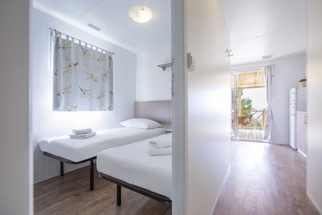 Človek by ani nepovedal, koľko je v takom mobilnom domčeku miesta. V tomto sa pohodlne vyspí až 6 osôb (v prvej spálni je manželská posteľ, v druhej dve oddelené lôžka a na rozkladací gauč sa zmestia ešte dve deti). O príjemnú teplotu sa v izbe zase postará klimatizácia. V plne vybavenej kuchyni si môžete pripraviť kulinárske špeciality, ktoré si vychutnáte pri televízii alebo na terase s výhľadom na okolie.
