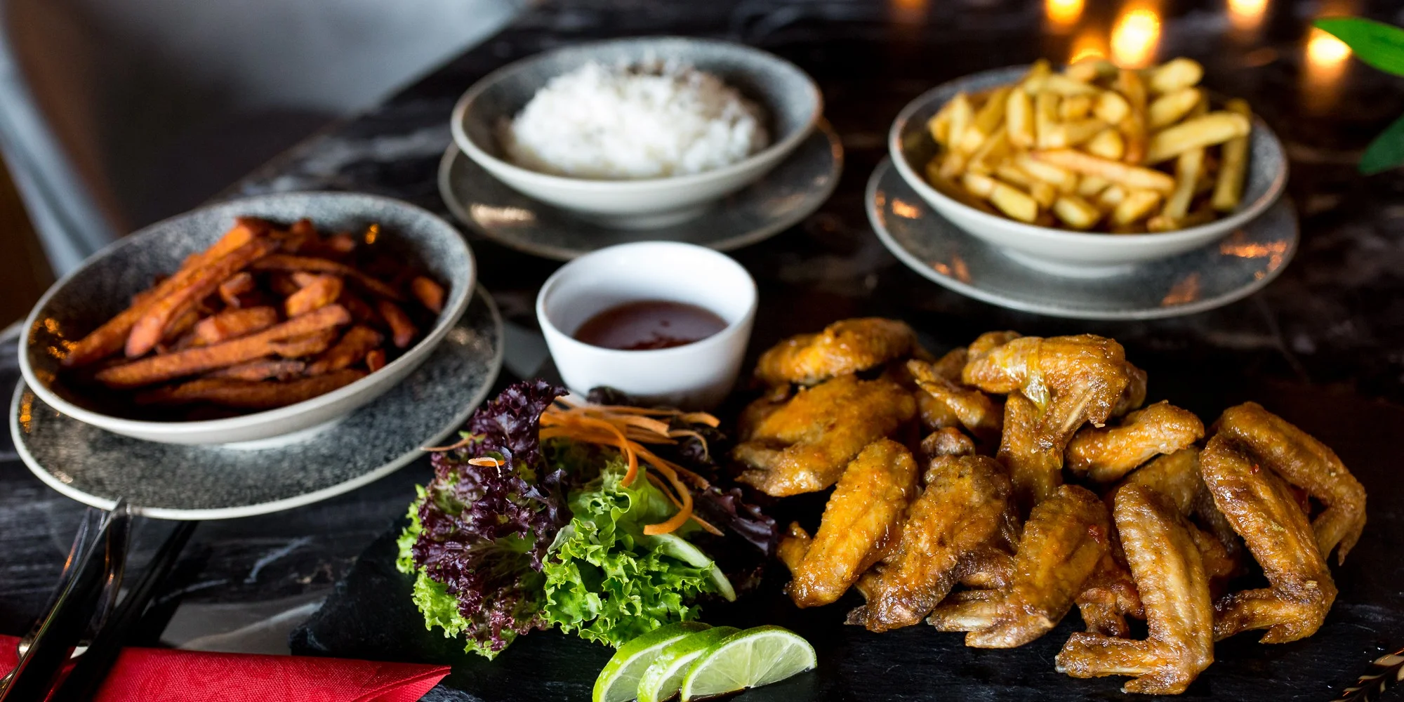 Ku krídelkám si môžete vybrať jednu z troch príloh – ryžu, hranolčeky alebo batátové hranolčeky.