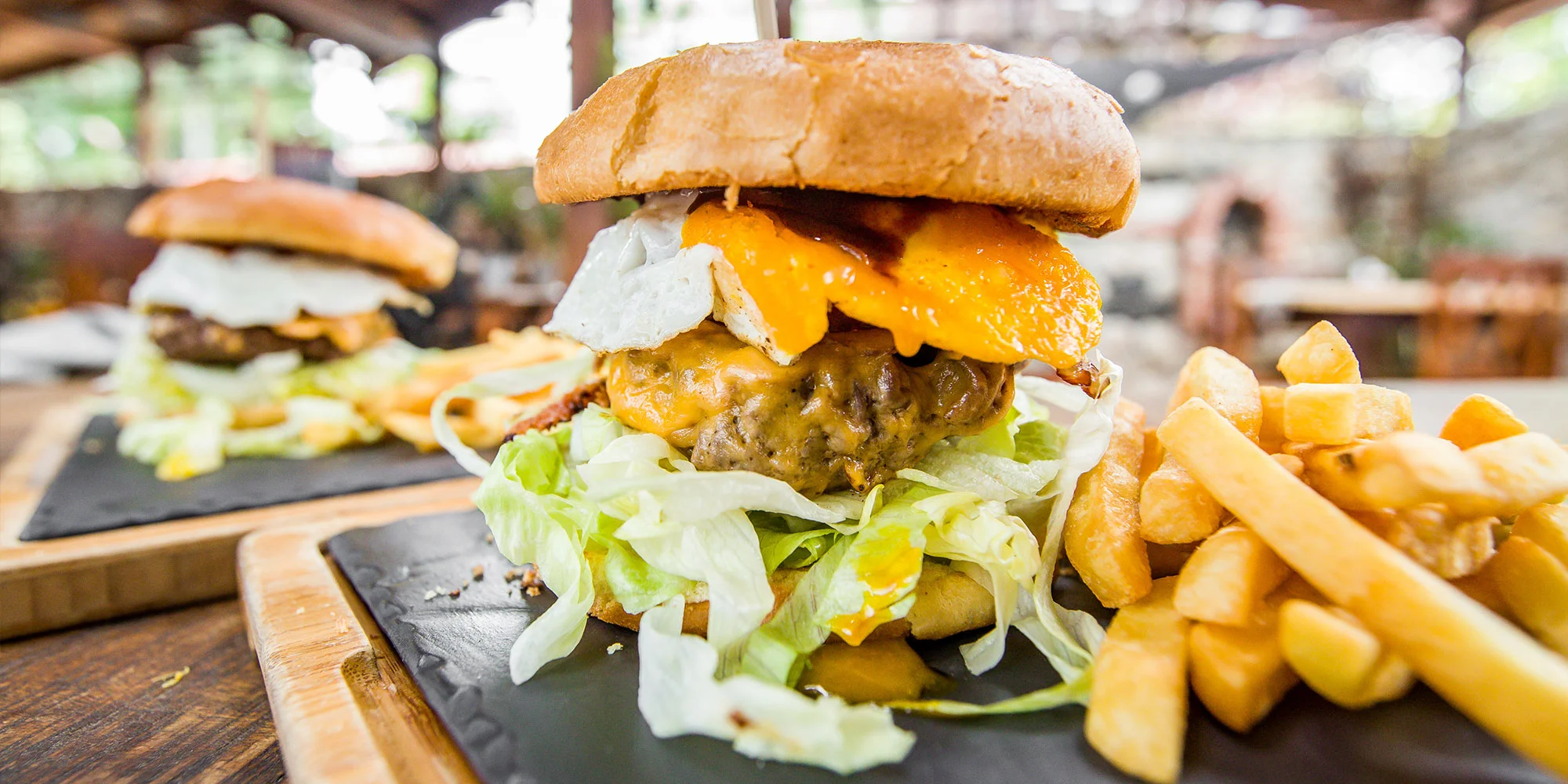 - Paradajka, červená cibuľa, ľadový šalát, uhorka, volské oko, čedar syr, slanina, BBQ omáčka, domáca majonéza (vlastná výroba)