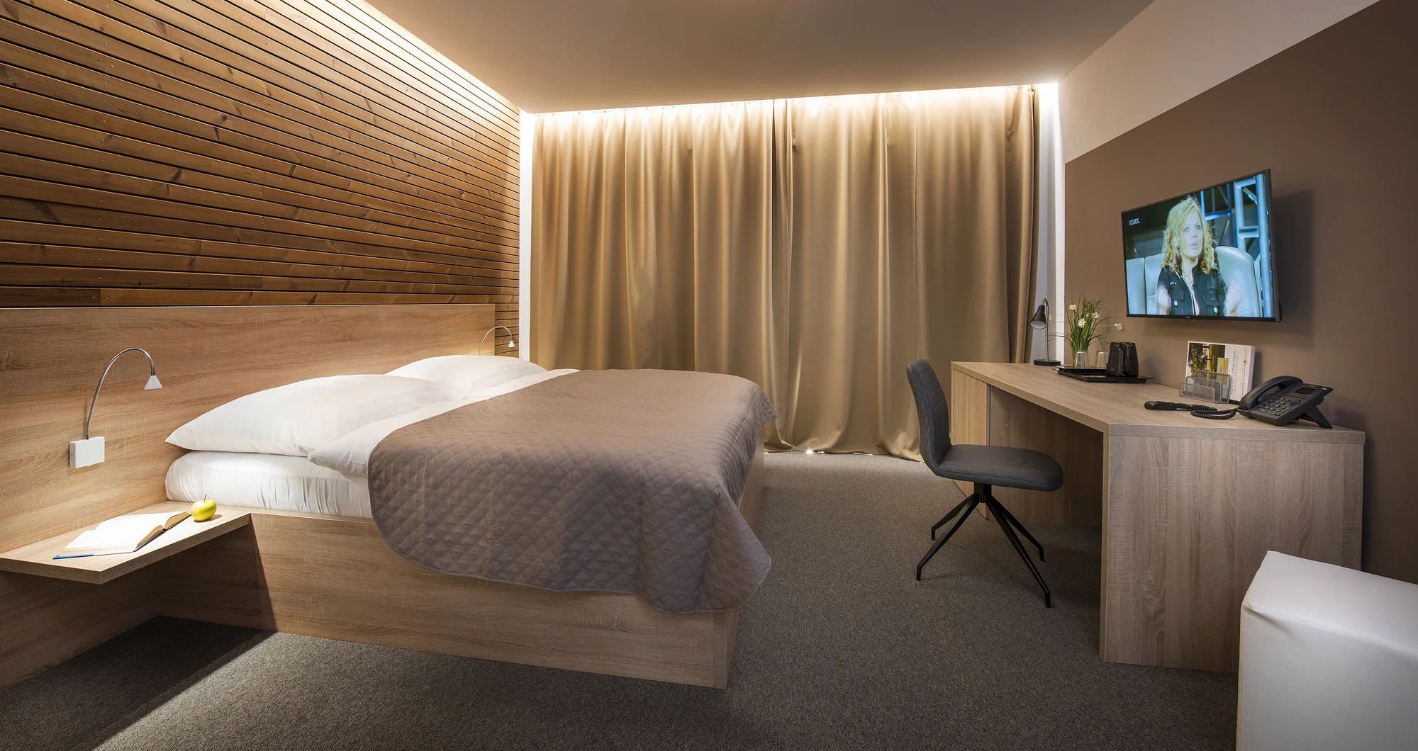 Izba Superior:Štýlová dvojlôžková izba SUPERIOR s možnosťou 1 prístelky (v prípade potreby je možnosť prepojiteľných izieb) je umiestnená v úplne novom hoteli. Disponuje rozlohou až 23 m2, balkónom s posedením a moderným vybavením. Vybavenie izby: