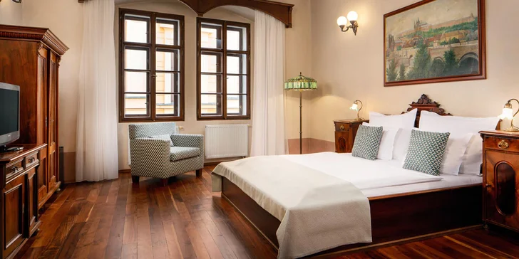 Chcete mať krásny výhľad z okna, pokochať sa umením alebo len nasať atmosféru stovežatej Prahy? Vybrať si môžete sami. Ak túžite bývať skôr v kľudnej časti budovy, tak siahnite po izbe Superior s výhľadom do malebnej pražskej uličky alebo sa ubytujte v historickom type s pôvodnými drevenými stropmi či nástennými maľbami. Do ružova sa vyspíte aj v izbe Deluxe, ktorá je za príplatok. Všetky ubytovacie jednotky majú veľkú manželskú posteľ s možnosťou prístelky. Tešiť sa môžete na štýlový nábytok, klimatizáciu a mramorovú kúpeľňu s vaňou alebo sprchovým kútom.