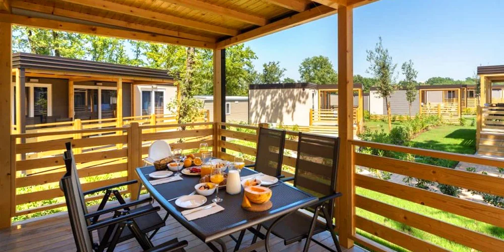 V príjemnom eko kempe, ktorý je plný zelene, na vás bude čakať mobilný dom s kapacitou 6–8 osôb v závislosti od toho, v akom počte dorazíte. Všetky domčeky majú pohodlné lôžka, terasu, kuchyňu, klimatizáciu a kúpeľňu so sprchovým kútom a toaletou. Súčasťou kempu sú bary a reštaurácie, nájdete tu tiež množstvo ihrísk a vonkajšie bazény s atrakciami pre deti. Krásna piesočnato-kamienková pláž, ktorá patrí ku kempu, je ocenená Modrou vlajkou za čisté a upravené prostredie.