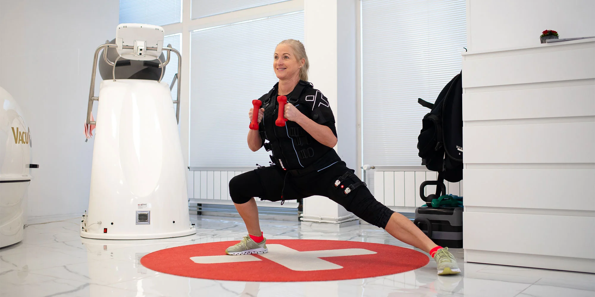 Počas cvičenia máte na sebe špeciálnu vestu, do ktorej sú elektródy zapojené. EMS aktivuje kontrakcie svalov oveľa intenzívnejšie a cielene, a tým vám pomáha cvičiť oveľa efektívnejšie. Vďaka synchrónnemu rozloženiu záťaže sa dokáže v jedinom cviku aktivovať naraz viac svalov, čím sa umožňuje bezpečne precvičiť až 90 % svalstva za neuveriteľných 20 minút cvičenia a nezaťažovať pritom kĺby ani väzy.