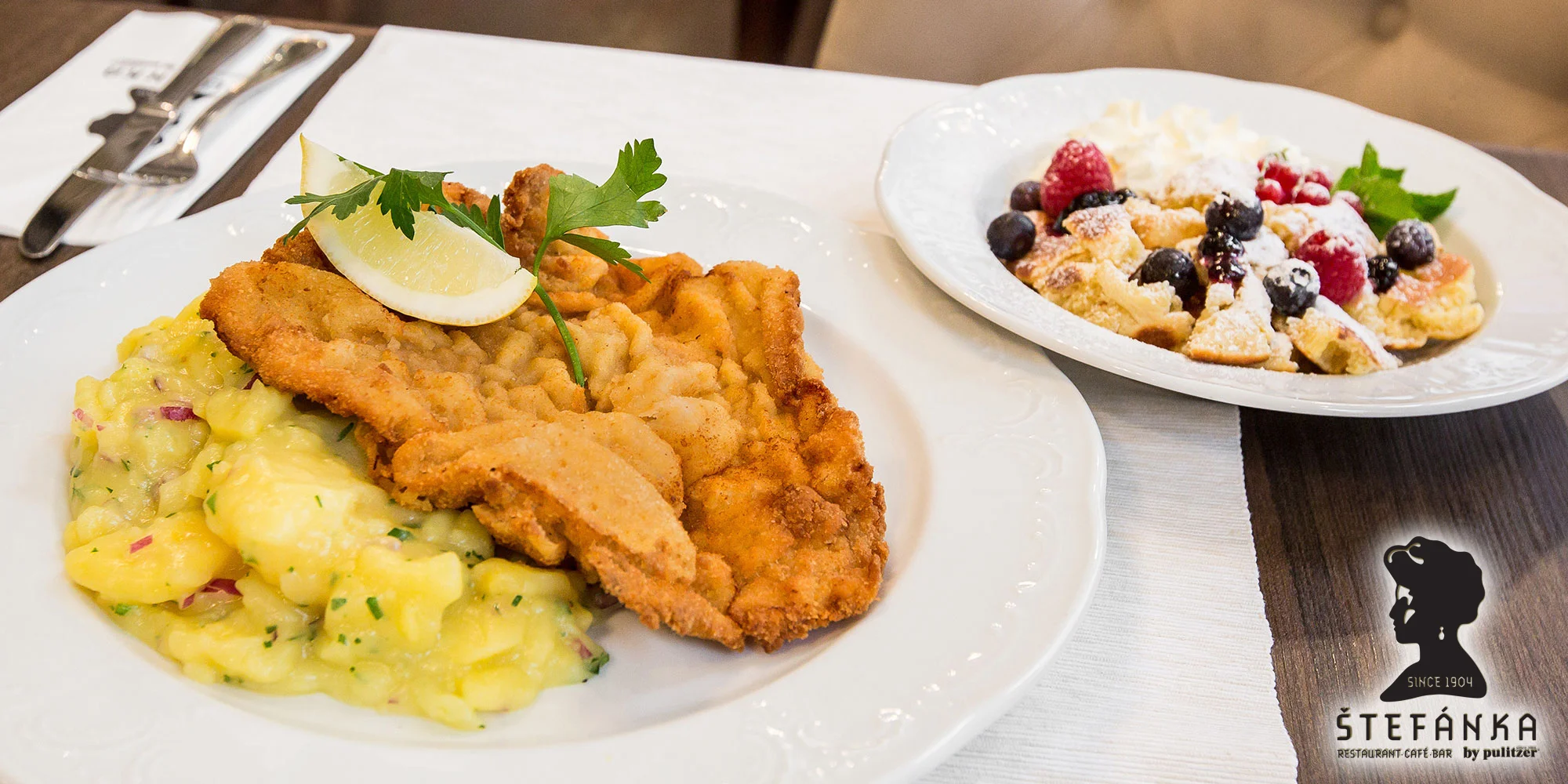 Pozývame vás do legendárnej reštaurácie Štefánka by Pulitzer. Dochrumkava vyprážaný a natenko vyklepaný viedenský teľací rezeň so slovenským zemiakovým šalátom a citrónom už rozvoniava v Starom meste! A po tejto fenomenálnej pochúťke sa môžete vrhnúť na cisársky trhanec s čučoriedkovým džemom a domácou šľahačkou.
