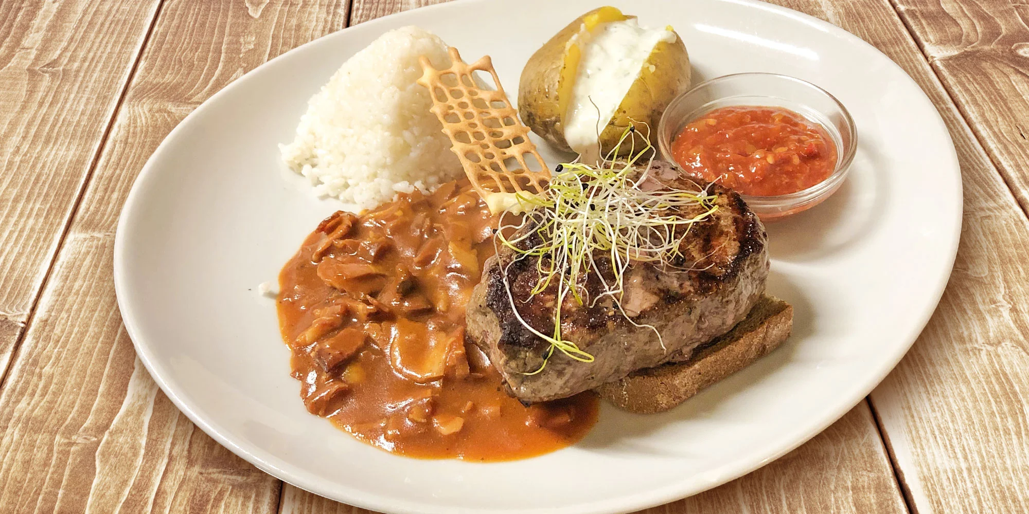 ALEBO - 200 g Steak New Guinea (hovädzia sviečkovica, anglická slaninka, pikantná omáčka) /alergény: 1, 7/ + 200 g Country zemiak s ryžou