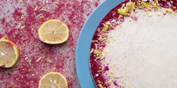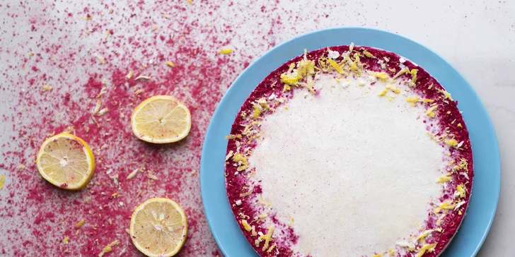 - Raw Lemon „Cheesecake“- Zloženie: mandle, kešu, kokosový olej, datle, kokos, citrón, agáve sirup, maliny sušené mrazom