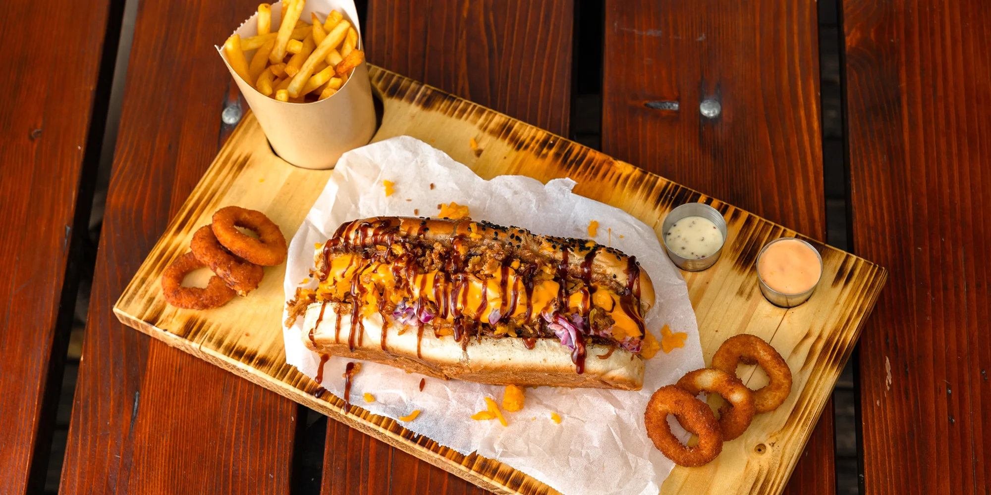 - 400 g Spicy Dog - klobásový párok, samuraj dressing, jalapeňos, slanina, cheddar, nachos (A: 1, 7, 11)