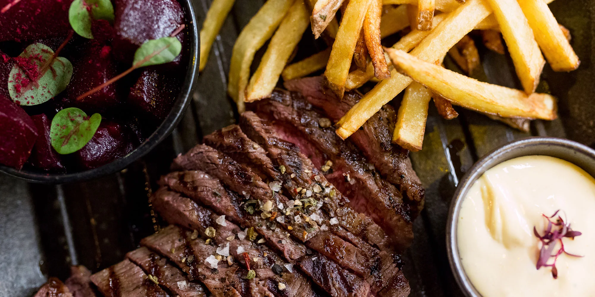 250 g Hovädzí DENVER steak s pečenou cviklou, hranolčekmi a domácou tatárskou omáčkou pre 1 osobu