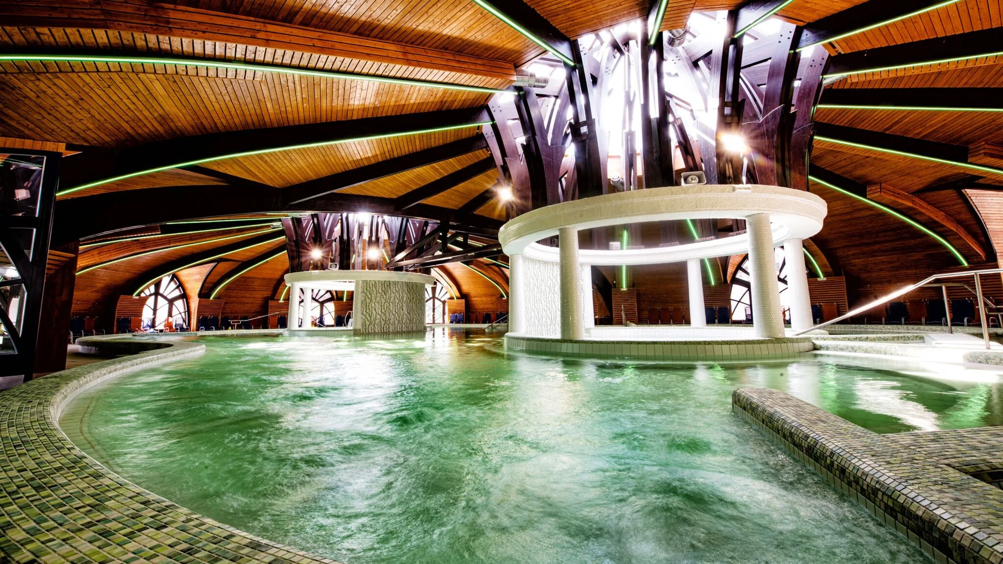 Liečebné centrum V starostlivo ošetrovanej prírodnej časti, ktorá má ojedinelú mikroklímu, sa nachádza z časti zatienený zrkadliskový sedací bazén s liečivou vodou. V krytej hale liečebného centra sa rozprestiera skupina bazénov, ktorá pozostáva z troch rôznych, samostatne fungujúcich bazénov. Zážitkový bazén s termálnou vodou 28–33 °C Atrakcie: masážne trysky, zrýchlovací kanál s vodným prúdom, veľký vodný hríb, masážne ležadlá, vodný prameň, sedací perličkový kúpeľ, dvojitá masážna tryska krku, chrlič, perličkový kúpeľ, podvodné reflektory Multifunkčný športový bazén s rozlohou 400 m2