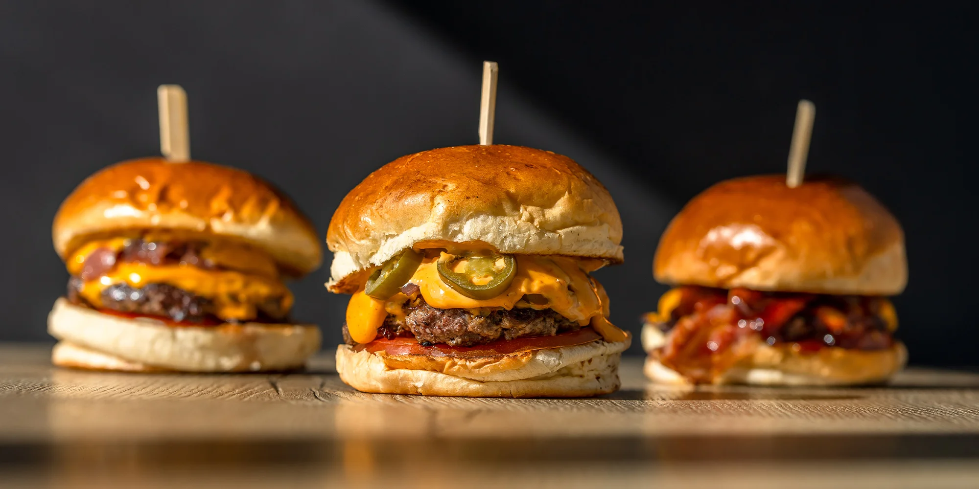 - 470 g Jalapeño burger - 150 g hovädzie mäso z biofarmy, samuraj dresing, domáca majonéza, dvojitý cheddar, jalapeño, karamelizovaná cibuľka, paradajka, kyslá uhorka (A: 1, 3, 7, 10)