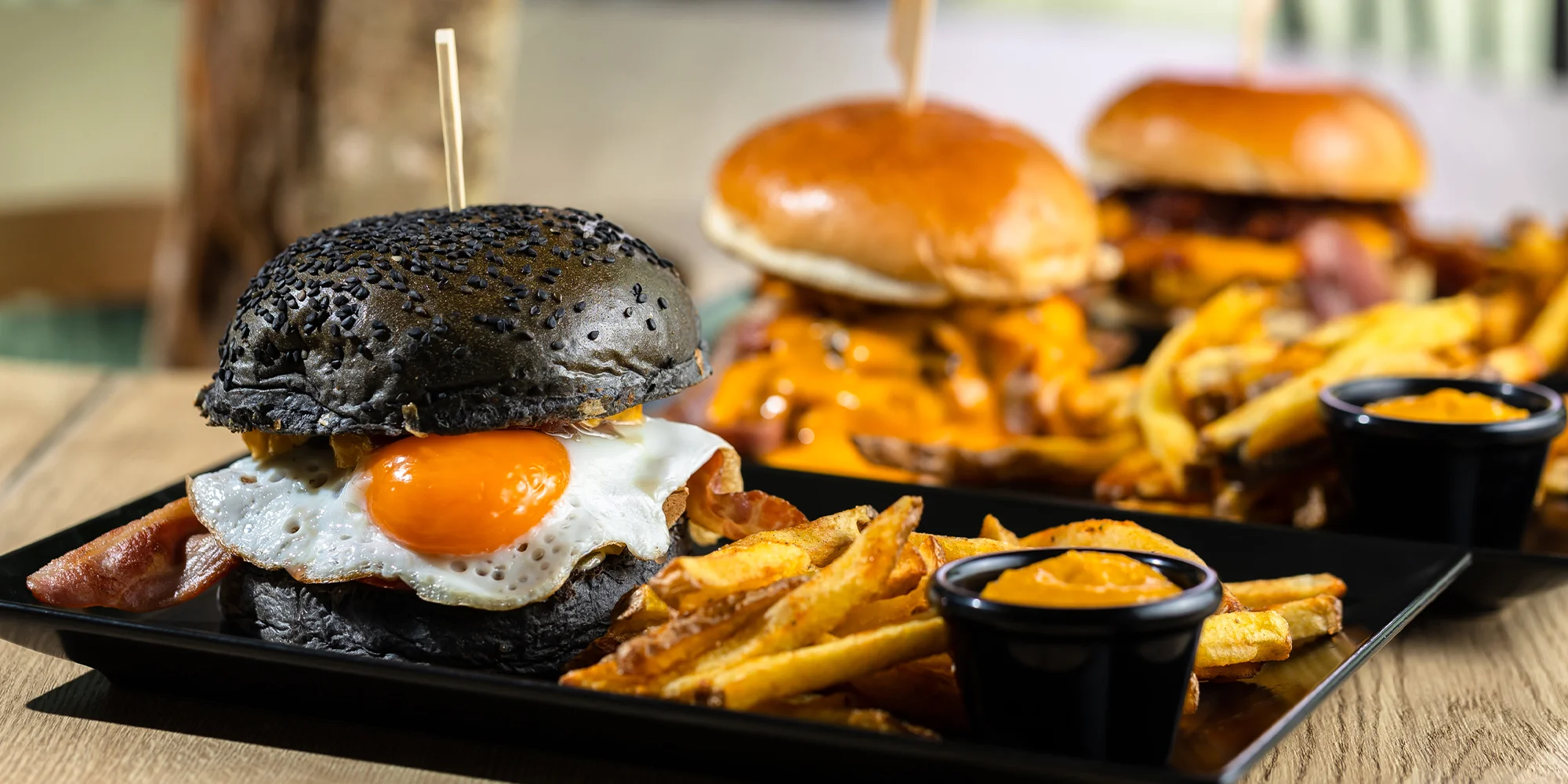 - 450 g Black burger - 150 g hovädzie mäso z biofarmy, sweet curry onion dresing, domáca majonéza, dvojitý cheddar, slanina 20 g, vajíčko, karamelizovaná cibuľka, paradajka, kyslá uhorka