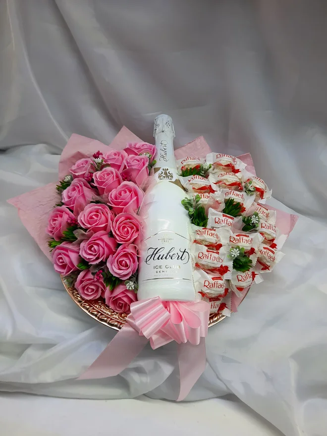 Ak hľadáte čosi skutočne špeciálne, zbystrite pozornosť: Darček De Lux na tanieri s mydlovými ružami obsahuje okrem mydlových ruží aj sladkú pochúťku Raffaello a šumivé biele víno Hubert ICE CLUB. Doprajte svadobnému páru na začiatok spoločnej cesty aj trochu cukru, nech je ich spoločná cesta sladká.