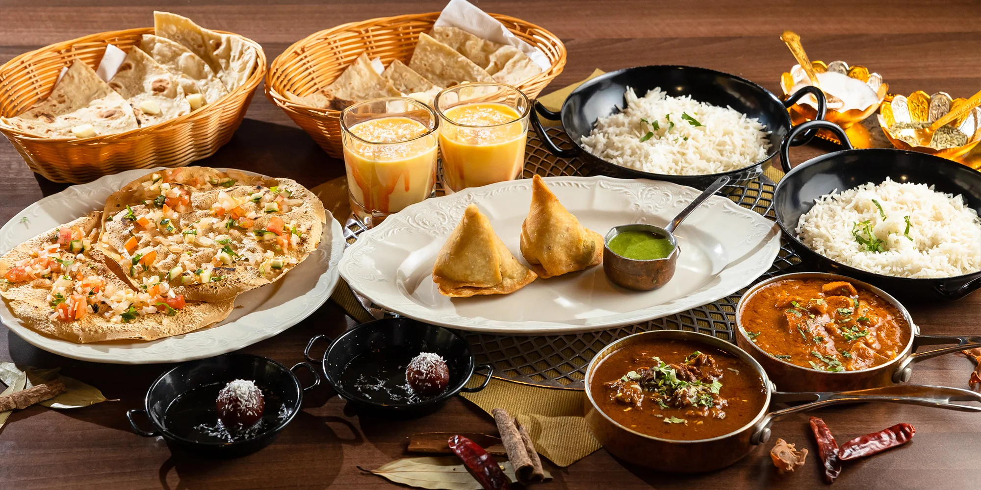 - 2 ks Masala Papad – fritovaný kreker zo šošovicovej múky plnený cibuľou, paradajkami, uhorkou s čili a koriandrom