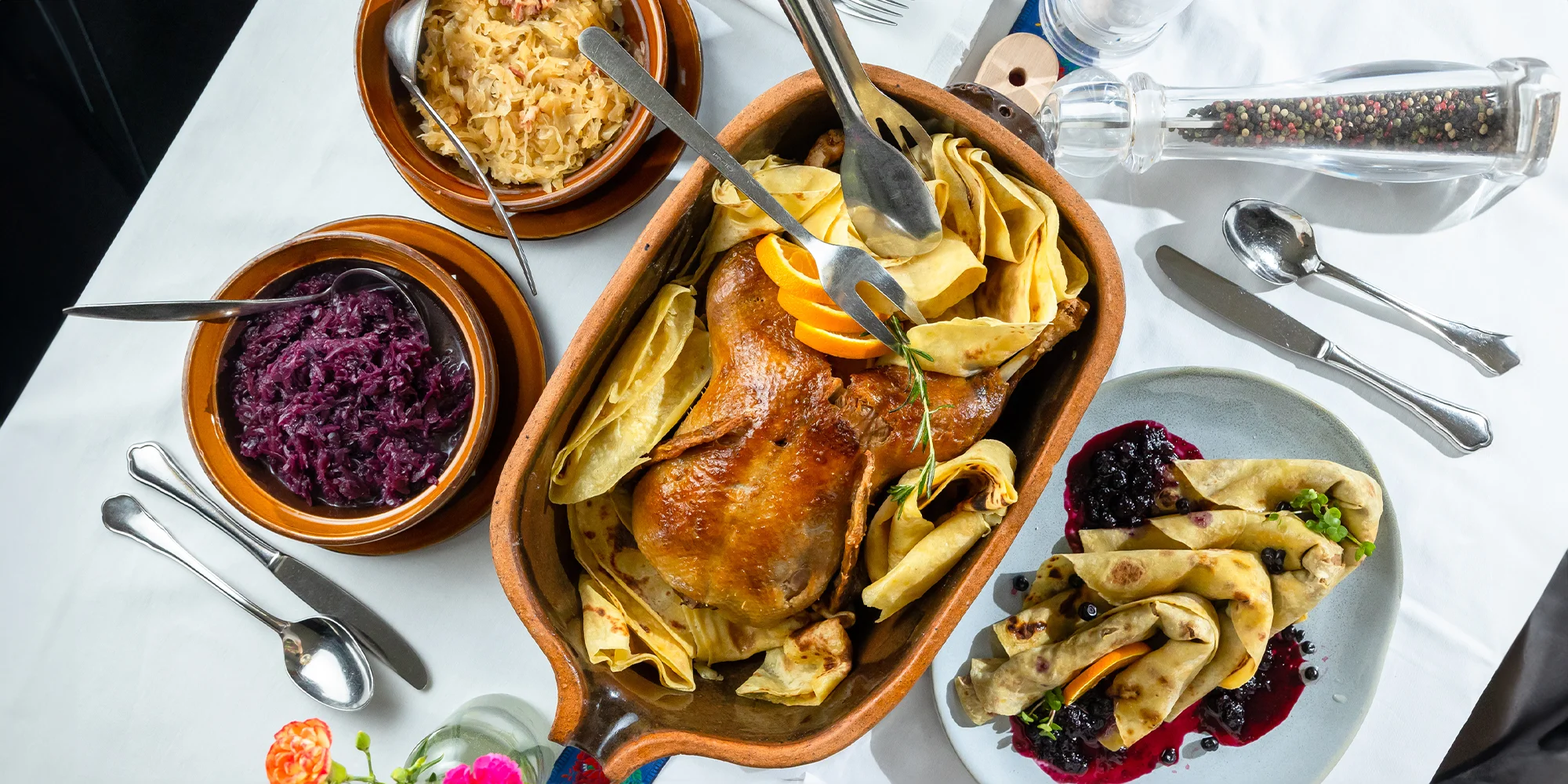 - 550 g Kačacia štvrťka, karamelizovaná červená kapusta, dusená kyslá kapusta, 2 ks lokša (A: 1, 3, 12)