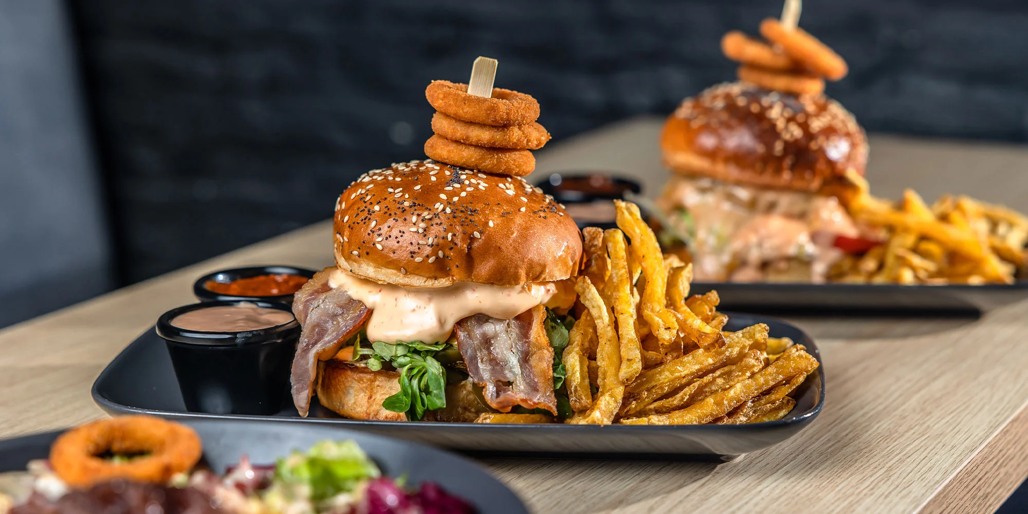 - Burger Saladas (bez žemle) - 150 g hovädzí krk z mladého býka 100 % (SK), mix listových šalátov, domáci americký dressing, paradajka, kyslá uhorka, karamelizovaná cibuľka, cheddar, ementál, domáce hranolčeky s dressingom, cibuľové krúžky, coleslaw (A: 3, 10)