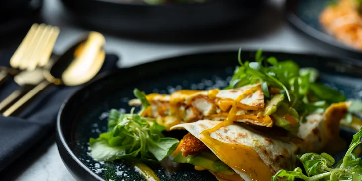 - Quesadilla - pšeničná tortila s kuracím mäsom v panko strúhanke, s cheddarom, avokádom, koriandrom, podávaná s mango-chilli salsou