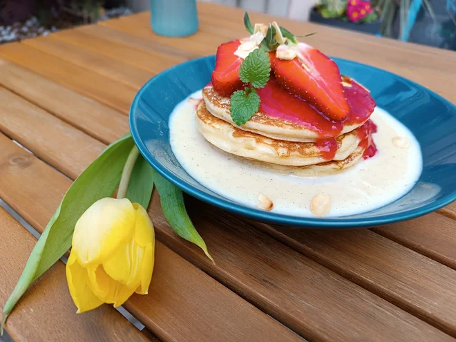 - Jahodové lievance s vanilkovým krémom (4 ks lievance, vanilkový puding, jahodový preliv, jahody, džem, mandľové lupienky, domáci zlatý sirup)