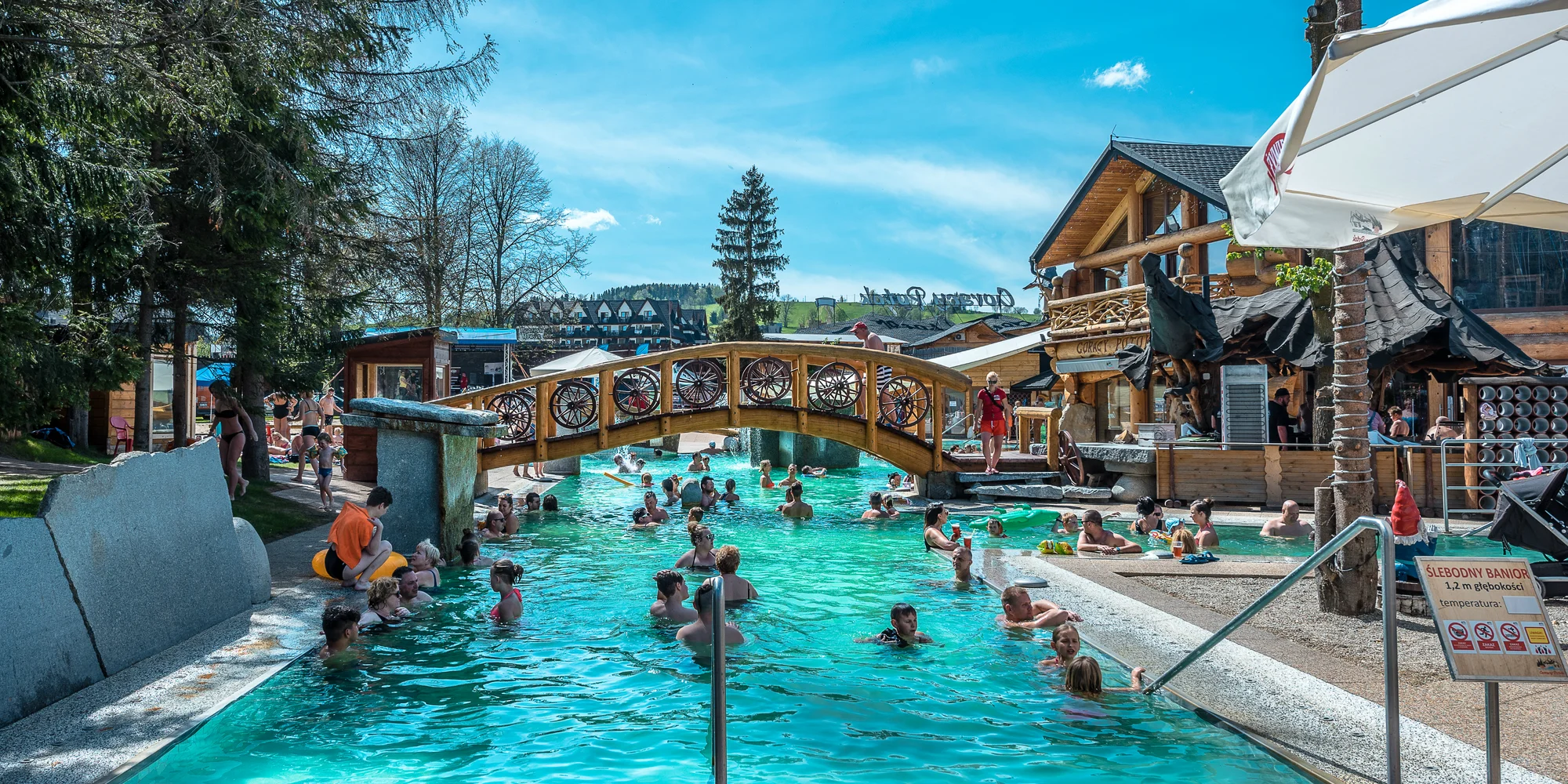 V bazénoch sa nachádza prírodná alebo sírna voda, ktorá má blahodárne účinky pre vaše telo. Bazény sú vybavené fontánami, vodometmi, tryskami, vodnými masážami, gejzírami a šmykľavkami, ktoré zaručujú skvelú zábavu pre deti aj dospelých. Saunový svet je určený pre osoby, ktoré hľadajú uvoľnenie a pokoj a rady si oddýchnu vo výnimočnom goralskom prostredí. Vo wellness zóne vás čakajú 4 komorné náladové bazény a 2 sauny (parná a soľná). Využiť môžete aj jacuzzi alebo ochladzovacie kade. |