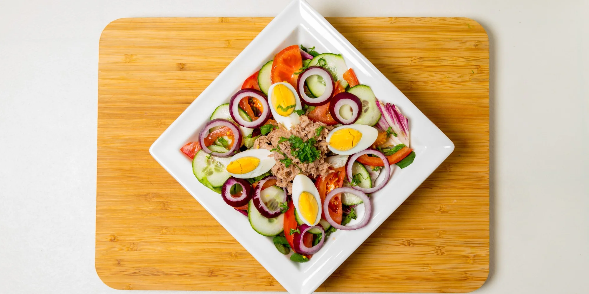 - 1 × 300 g Šalát tuniakový - mix listovej zeleniny, paradajky, uhorka, červená cibuľa, vajíčko, tuniak + 3 ks opečenej bagetky (A: 3, 4)