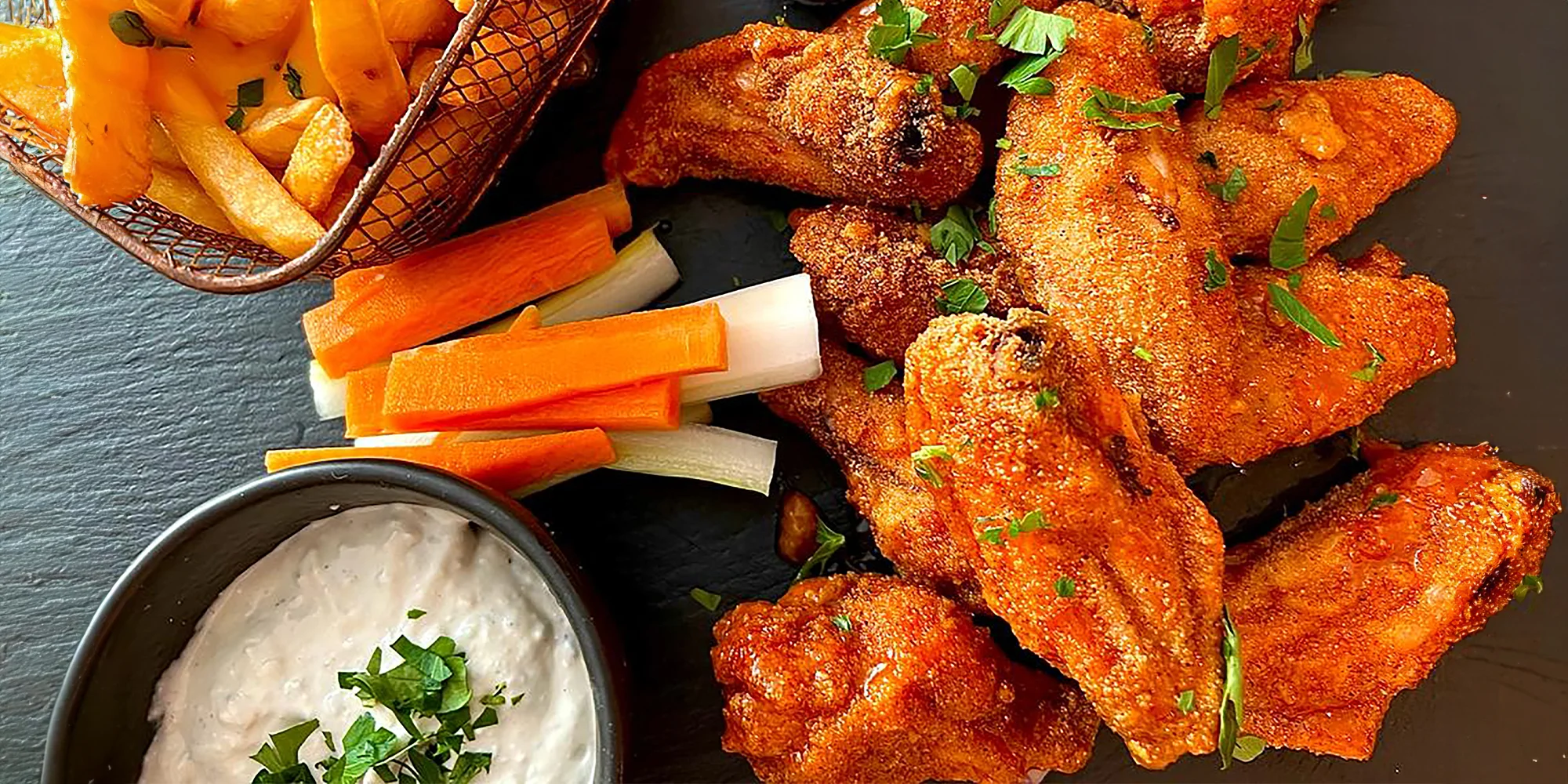 - Buffalo wings (pikantné) - tradičné vyprážané pikantné krídelká preliate buffalo omáčkou + raw mrkvové a zelerové hranolčeky + bluecheese dressing