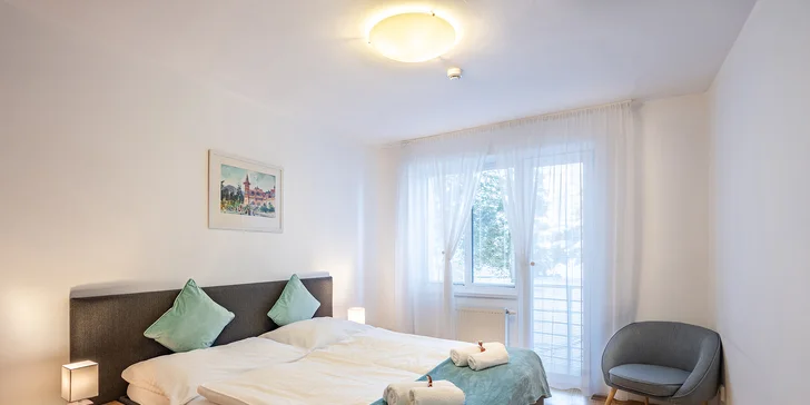 Apartmány sú skutočne priestranné a zariadené kvalitným nábytkom, aby ste sa cítili pohodlne. Väčší priestor naviac umožňuje ubytovať v prípade potreby väčšiu skupinu hostí. Na výber máte apartmán s jednou spálňou pre 2 osoby a s dvoma možnými prístelkami. Pre väčší počet návštevníkov je zase pripravený apartmán s dvoma spálňami, kde sa pohodlne ubytujte až 6 osôb. Apartmány majú plne vybavenú kuchyňu, vrátane umývačky riadu. Samozrejmosťou je Wi‑Fi, satelitná TV a v každom apartmáne je balkón.