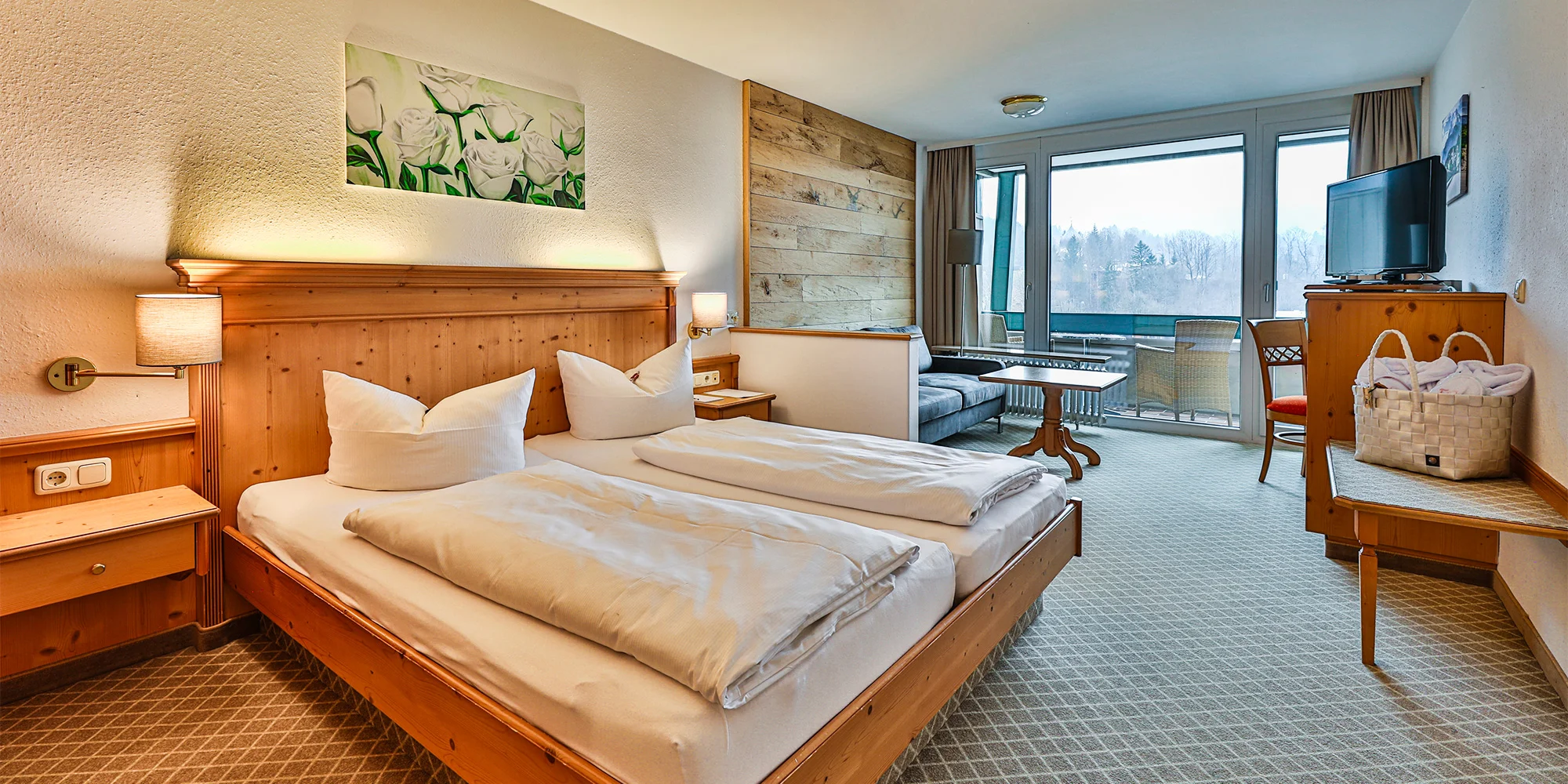 Zabývate sa v pohodlnej dvojlôžkovej izbe vybavenej moderným dreveným nábytkom. Všetky izby majú samostatnú kúpeľňu so sprchovacím kútom alebo vaňou, samozrejmosťou je Wi‑Fi pripojenie, televízia a v obývacej časti nájdete aj písací stôl a pohovku alebo kreslá. A ako najlepšie naštartovať deň? Predsa výhľadom z balkóna na okolitú horskú krajinu.
