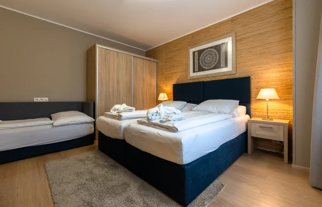 Bývať budete v štýlovo zariadenej dvojlôžkovej izbe so samostatnou kúpeľňou, v ktorej sa nachádza sprchový kút, toaleta aj sušič na vlasy, alebo v apartmáne podľa svojho výberu. Dvojlôžkový apartmán Basic aj štvorlôžkový apartmán Superior (s dvomi samostatným spálňami) disponujú obývacím priestorom s pohodlnou sedacou súpravou a možnosťou dvoch prísteliek. Ani v apartmánoch nechýba súkromná kúpeľňa s vaňou či sprchovým kútom, toaletou a sušičom na vlasy. Počas ubytovania budete mať k dispozícii aj TV s plochou obrazovkou, minibar, trezor a pripojenie na Wi‑Fi. Okrem pohodlia v štýlovo zariadených izbách si budete vychutnávať aj nádherný výhľad na Štiavnické vrchy alebo na pokojný Hodrušský tajch. Priamo na izbe vás tiež budú čakať pohodlné župany a uteráky.