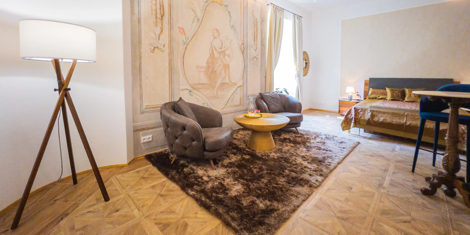 Špeciálnu pozornosť môžete venovať apartmánu Fresco, ktorý je jedinečný, a to vďaka umelecky reštaurovaným freskám Apolóna a Afrodity z konca 18. storočia a je určený hlavne pre nadšencov umenia a histórie. Súčasťou apartmánu Fresco je aj chodba, ktorá slúži ako spoločenská miestnosť s hrami, šachovým stolíkom a knihami pre 3 apartmány – Elegance, Romance a Fresco. Chodba je prístupná len pre ubytovaných hostí týchto 3 apartmánov. Fresky nájdete tiež v apartmáne Carmen a Rigolleto.