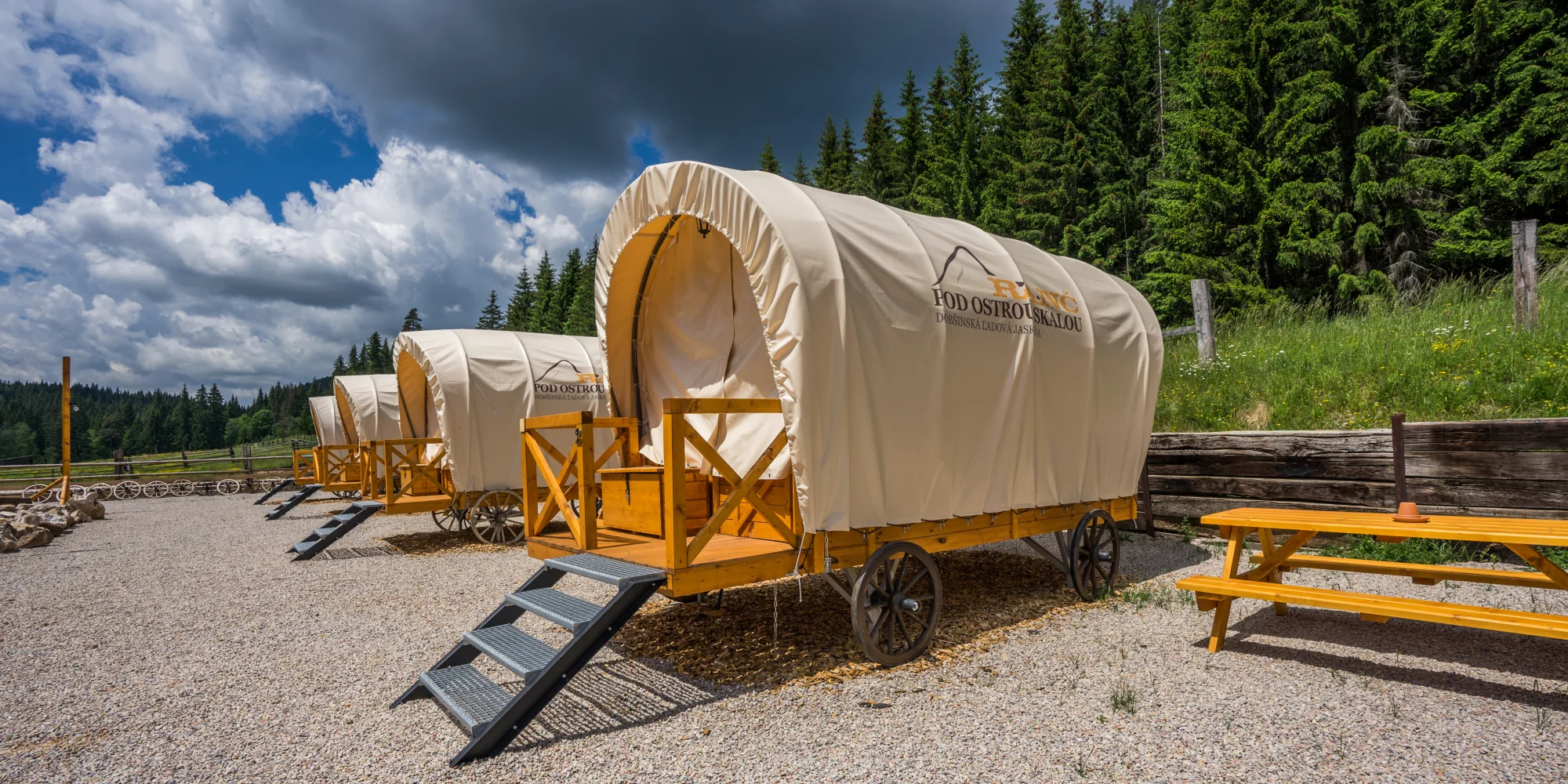 Ste milovníkmi nezvyčajného ubytovania? Potom ste na správnej adrese. Vybrať si môžete z romantickej chalúpky, indiánskeho stanu či dostavníkového vozu. Ak by ste predsa len chceli niečo tradičné, tak v ponuke je tiež penzión SALOON s izbami Štandard a apartmánmi v americkom motelovom štýle. Izby a apartmány majú kuchynské spotrebiče (mikrovlnná rúra, čajník, kávovar, chladnička) a samostatný vchod, čo zabezpečuje hosťom ešte väčší komfort a súkromie. Vyraziť môžete vo väčšej skupine, zmestí sa sem až 6 osôb.