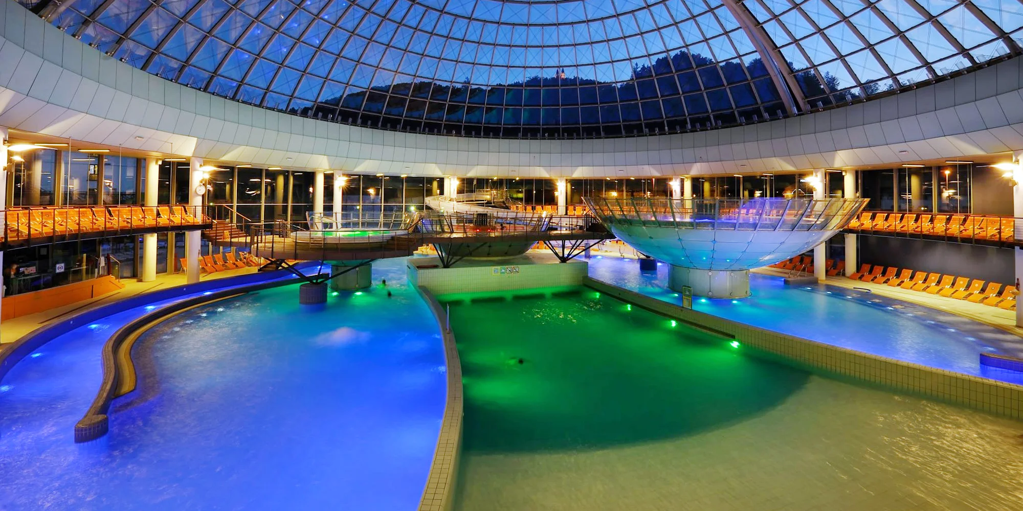 Vnútorná časť: bazén s vlnovými efektmi, rekreačný a masážny bazén s vodopádmi a podvodnými prameňmi, divoká rieka, detský vodný zábavný park, tri vírivé bazény nad bazénom, Kneippov chodník, tobogán (teplota vody vnútorných častí je 31–34 °C)