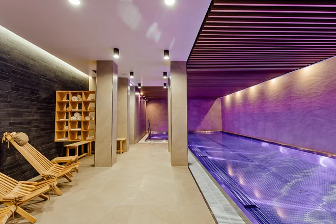 • 13-metrový bazén s protiprúdom a masážnymi tryskami, suchá a parná sauna, ochladzovacia kaďa, relaxačná miestnosť