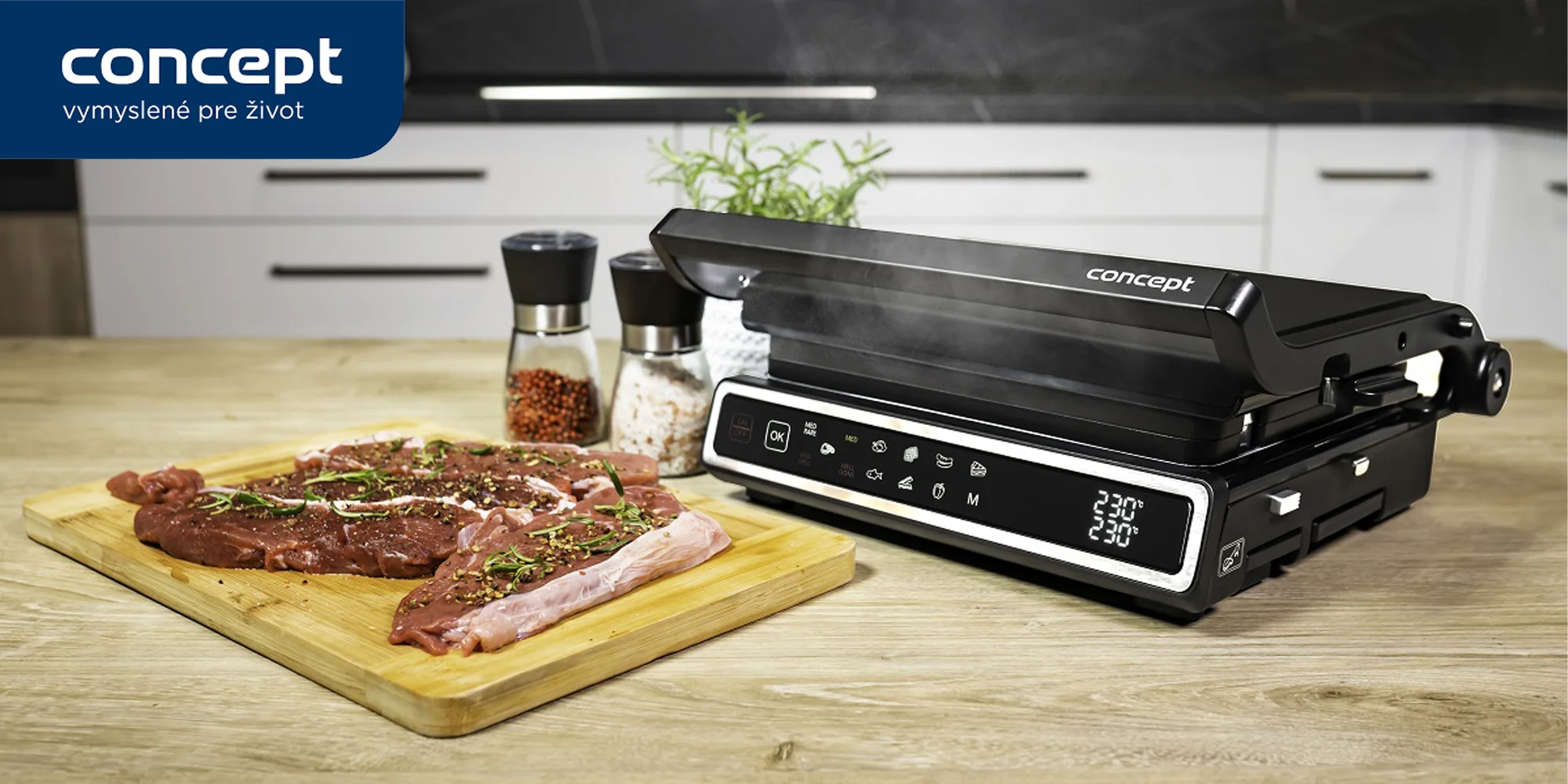 Teplotná sonda postráži úroveň prepečenia mäsaKontaktný gril Concept GE3600 je vybavený praktickou teplotnou sondou, ktorú oceníte predovšetkým pri príprave mäsa. Sonda sleduje vnútornú teplotu pokrmu a zobrazí ju priamo na displeji grilu, čo vám umožní ľahko kontrolovať úroveň prepečenia . Jednoducho ju zapichnite do mäsa a nechajte gril postrážiť dokonalý výsledok – či už máte radi mäso šťavnaté alebo viac prepečené. Grilovanie s touto funkciou bude o poznanie jednoduchšie a presnejšie. Grilujte po celý rok bez obmedzeniaElektrický kontaktný gril so skleneným povrchom prináša štýlové a praktické riešenie na prípravu jedál bez ohľadu na počasie. Už žiadne komplikácie s vonkajším grilovaním kvôli dažďu – tento gril môžete využívať ako na terase, tak aj v interiéri, napríklad v kuchyni alebo na balkóne. Vďaka tomu, že nevytvára dym ani silné pachy, nemusíte mať obavy z rušenia susedov. Obojstranné grilovanie zaistí rýchlu a rovnomernú prípravu pokrmov bez nutnosti neustáleho obracania. Navyše s presnou reguláciou teploty máte istotu, že vaše jedlo bude pripravené zdravšie a bez pripálenia. BBQ grilovanie s individuálnym nastavením teploty pre každú doskuKontaktný gril GE3600 ponúka možnosť BBQ grilovanie na otvorenom grile, čo vám umožní pripraviť jedlo pre celú rodinu na jednej veľkej grilovacej ploche. Vďaka funkcii SPLIT ZONE môžete nezávisle nastaviť teplotu každej grilovacej dosky, takže si ľahko prispôsobíte teplotu pre rôzne druhy pokrmov. Táto kombinácia vám prinesie maximálnu flexibilitu a pohodlie pri varení, a zaistí, že hlavný chod aj prílohy budú hotové podľa vašich predstáv. Perfektný steak podľa vašich predstávMáte radi dokonale pripravený steak, ale nedarí sa vám dosiahnuť presne tú úroveň prepečenia, ktorú si prajete? S funkciou GRILL ASSISTANT už nemusíte váhať. Stačí zapichnúť teplotnú sondu do mäsa, vybrať požadovanú úroveň prepečenia – či už krvavý, medium alebo dobre prepečený – a gril sa postará o zvyšok. Výsledkom bude steak presne podľa vašich predstáv a úplne bez námahy.