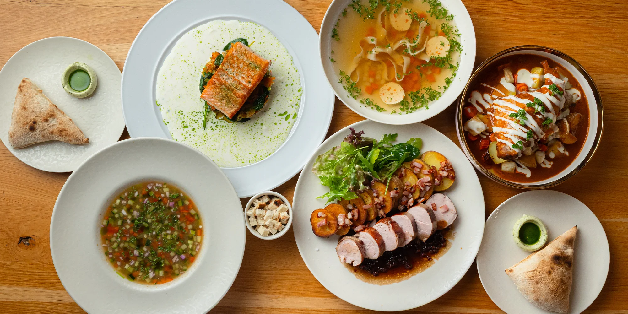 Vaše spoločné hodovanie začne chrumkavým domácim chlebíkom s bazalkovým maslom, ktorý príjemne naladí chuťové poháriky. Po predjedle zväčša plynulo nasleduje polievka. Inak, tomu nebude ani v tomto prípade. Môžete si zvoliť gazpacho s krutónmi alebo siahnuť po hrejivom kuracom vývare s domácimi rezancami.