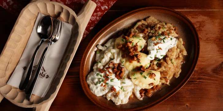- 1 × 450 g Richtársky tanier - bryndzové halušky, zemiakovo-bryndzové pirohy, strapačky s kyslou kapustou a so slaninkou a opraženou cibuľkou