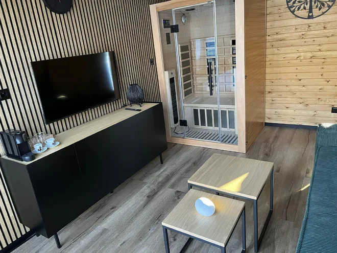 Poteší vás aj veľká záhrada (neoplotená), kde je gril na uhlie a kovové prenosné ohnisko. Na terase sa ponoríte do vírivky a užijete si relax. Vo vnútri chaty sa potom môžete do sýtosti vyhriať v infrasaune (podľa variantu). A ak prídete s deťmi, aj tie sa tu ľahko zabavia – je tu trampolína, malé ihrisko, hojdačka a stolný tenis.