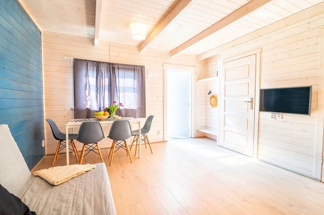 V každom domčeku sú 2 spálne (jedna s manželskou posteľou, druhá s dvoma jednolôžkami), obývacia izba s rozkladacou pohovkou, kuchynský kút a kúpeľňa so sprchou. Nechýba samozrejme stôl so stoličkami a televízor a zadarmo sa tu pripojíte k Wi‑Fi, aby ste mohli rovno zdieľať fotky z dovolenky.