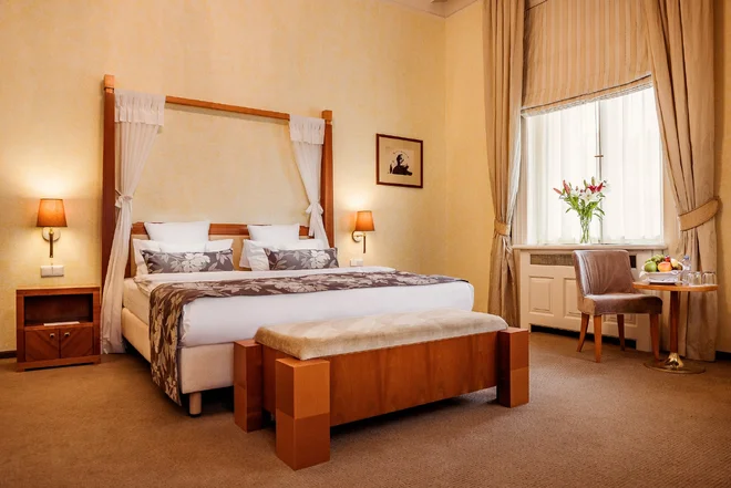 pohodlí secesnej dvojlôžkovej izby strávite nerušene predĺžený víkend aj celú dovolenku. Keď vás z pohodlnej postele vyláka slniečko k pohľadu z okna, bude to ešte lepšie. Hneď z rána sa totiž pokocháte výhľadom na Týnsky chrám, Kráľovskú cestu či Staromestské námestie. Ešte magickejšie to bude večer, keď si k tomu otvoríte fľašu prosecca, ktorá pre vás bude pripravená na izbe.