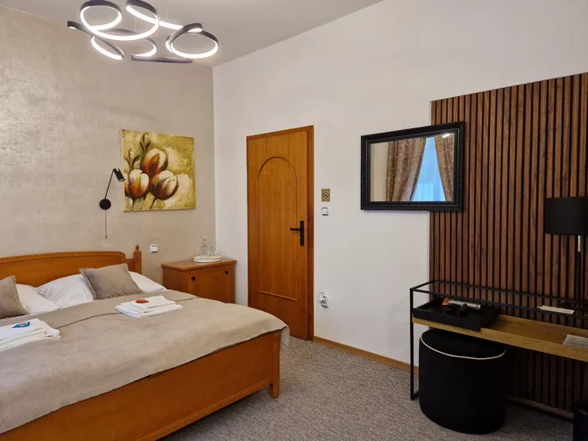 Vychutnajte si komfort a súkromie v príjemne zariadenej dvojlôžkovej izbe s pohodlnou manželskou posteľou. Izba disponuje vlastnou kúpeľňou s vaňou a ponúka ideálne miesto na relax po dni plnom zážitkov.