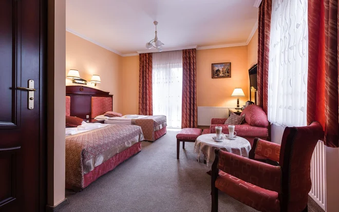K parádnemu pobytu si môžete vybrať z dvoch typov izieb: Standard a Deluxe. Obe izby ponúkajú priestor 17 m², pohodlné postele (aj možnosť prístelky), kúpeľňu so sprchou a WC, TV a Wi‑Fi pripojenie. Typ Deluxe má navyše minichladničku, set na prípravu kávy a čaju a balkón. V cene pobytu máte zabezpečenú polpenziu v hotelovej reštaurácii – každý deň si vychutnáte raňajky a večere formou bufetu.