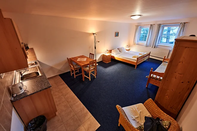 Izby aj apartmány sú jednoducho, ale účelne a útulne zariadené. Vždy je ich súčasťou kúpeľňa a TV, pri apartmánoch počítajte navyše s kuchynkou so základným riadom a mikrovlnkou. K dispozícii je aj extra priestranný mezonet, v ktorom pohodlne zloží hlavu až 8 osôb.