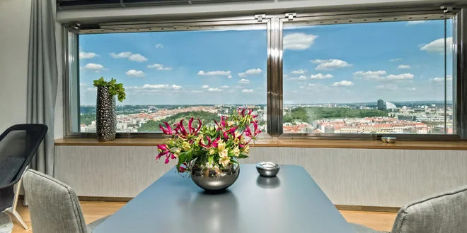 Ak by vám výhľad z vášho apartmánu nestačil, stačí vyjsť na vyhliadkové observatórium vo výške 93 metrov. Počas celého pobytu pre vás platí neobmedzený vstup. Pozorujte ráno prebúdzajúce sa mesto, ruch cez deň alebo sem príďte večer, keď sa začne stmievať a Praha sa začne rozsviecovať. Usaďte sa do preslávených bubble chairs, prezrite si výstavu, ktorá sa vždy koná v jednej z kabín observatória, a kochajte sa tou krásou okolo.