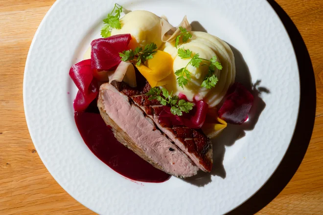 • 380 g Grilované kačacie prsia, zemiaková kaša, nakladaná cvikla, omáčka z červeného vína (A: 7)