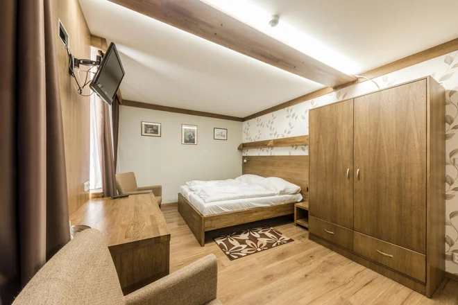 Hotelové izby sa nachádzajú v hlavnej budove strediska, ktorá sa člení na ubytovaciu časť a športovo-relaxačnú časť. Zabývate sa v dvojlôžkovej alebo trojlôžkovej izbe. K dispozícii budete mať súkromnú kúpeľňu so sprchovým kútom. Samozrejmosťou je dostupné Wi‑Fi pripojenie. V izbách nájdete všetko potrebné vybavenie.