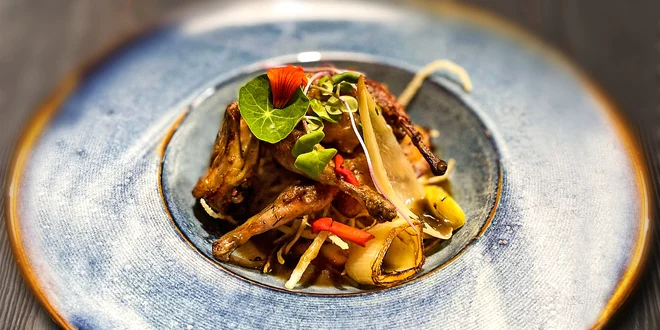 Pripravujú tu jedlá českej aj medzinárodnej kuchyne a v maximálnej miere využívajú suroviny od lokálnych dodávateľov a z vlastnej biofarmy v Maleticiach. Na farme okrem iného chovajú dobytok plemien Limousine, Charolais a novo aj japonské plemeno Wagyu. Mäso si sami rozrábajú, nechávajú ho vyzrievať 50 až 150 dní a potom upravujú v špeciálnej rúre, ktorá sa dokáže vyhriať až na 500 °C.