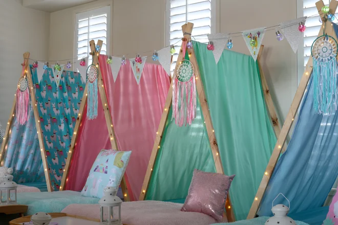 Spolu s TeePee je v cene prenájmu nafukovací matrac, posteľná bielizeň aj kompletné dekorácie v tému, ktorú si váš potomok zvolí.