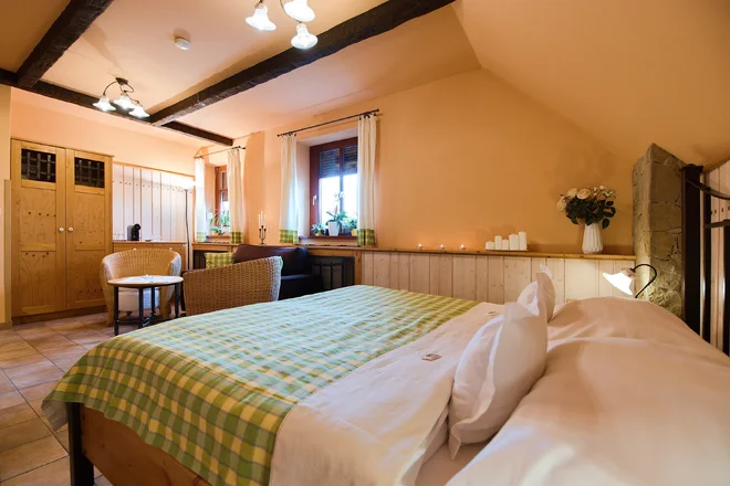 Vyberať budete medzi dvoma typmi izieb: Štandard a Nadštandard. Obe vás potešia svojím príjemným dizajnom, klimatizáciou, televíziou a Wi‑Fi pripojením. Samozrejmosťou je kúpeľňa so sprchou alebo vaňou a toaletou. Nadštandard je priestrannejší, má navyše obývaciu izbu s gaučom, ktorý môže prípadne poslúžiť ako prístelka. Príjemným bonusom bude fľaša vína zo Zámeckého vinařství Bzenec, ktorá na vás bude čakať na izbe.