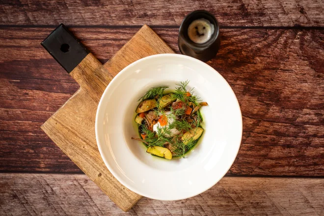 - Čierna hubová polievka, vajce, zemiak, zrejúci ovčí syr, kôpor, huby