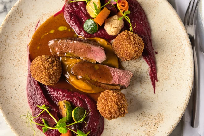 • 180⁠/⁠250 g Kačacie prsia s bryndzovými arancinami, tekvicovým pyré, pečenou tekvicou a pečenou cviklou (A: 1, 3, 7)