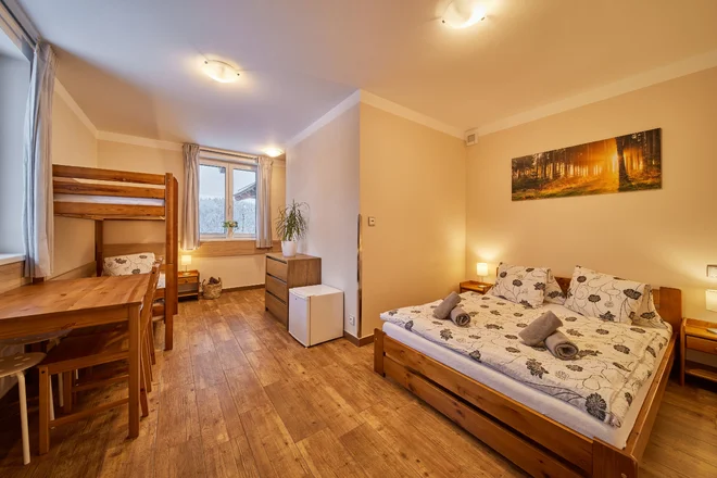 O vaše pohodlie sa postarajú dvoj- až štvorlôžkové izby. Ich súčasťou je vždy vlastná kúpeľňa so sprchovacím kútom a WC. Niektoré izby disponujú aj balkónom s krásnym výhľadom na Janské Lázně. V celom areáli sa pohodlne pripojíte k bezplatnému Wi‑Fi pripojeniu. Na každom poschodí máte k dispozícii plne vybavenú kuchynku s varnou doskou, mikrovlnnou rúrou a rýchlovarnou kanvicou.