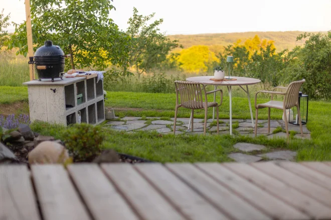 V stane s priemerom 5 m nájdete všetko, čo budete potrebovať – a ešte oveľa viac. Bočná priehľadná časť stanu je opäť situovaná na výhľady z pozemku. Pre sledovanie nočnej oblohy tu nechýba ani priehľadná časť strechy, ktorú môžete zatieniť diaľkovo ovládanou elektronickou roletou. Terasa vydláždená z prírodného kameňa vám ponúkne okrem pohodlného posedenia aj vonkajšiu kuchyňu. Tu máte k dispozícii multifunkčný keramický gril a príslušenstvo, ktorý vám umožní aj varenie, vyprážanie, ale aj prípravu pizze.